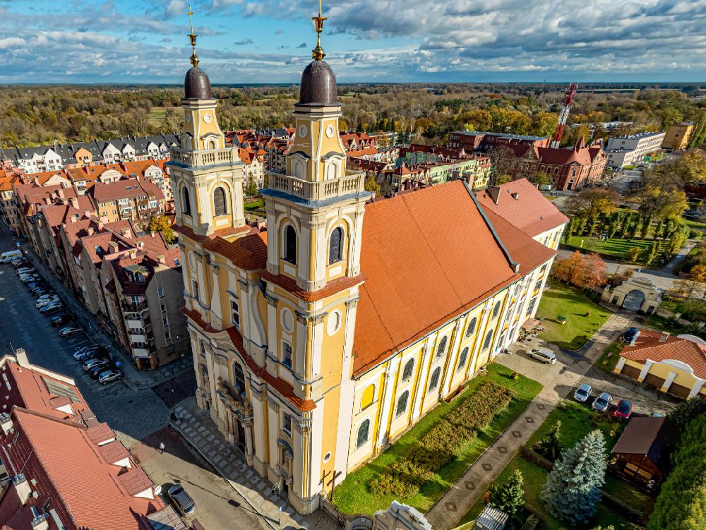 Kościół Bożego Ciała w Głogowie od razu zwraca uwagę barokową fasadą i wysmukłymi wieżami, które wyrastają ponad zabudowę dawnego kolegium jezuickiego i rysują się wyraźnie na tle odrzańskiego nieba. To miejsce, w którym bardzo wyraźnie czuć zarówno splendor epoki baroku, jak i ciężar historii miasta, które wielokrotnie stawało w ogniu pożarów i wojen, a mimo to wracało do życia. Już samo podejście do świątyni – od strony ulicy Morcinka, z widokami na kolegiatę i zamek – tworzy wrażenie zwiedzania zwartego kompleksu historycznego, w którym każdy budynek dopowiada kolejną część opowieści o dawnej potędze Głogowa.